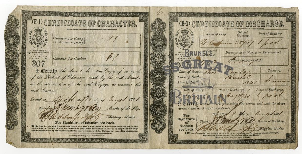 DescriptionCertificate of discharge of Thomas Taylor, member of crew on SS Great Britain. The document is dated 8th August 1861 and includes details of name of ship, official number and port of registry. It also gives name of crew member, date and place of birth, date of entry and date of discharge. Character of ability and conduct are both rated 'VG' or 'Very Good' and this is signed by Captain John Gray as 'Master of Ship'.