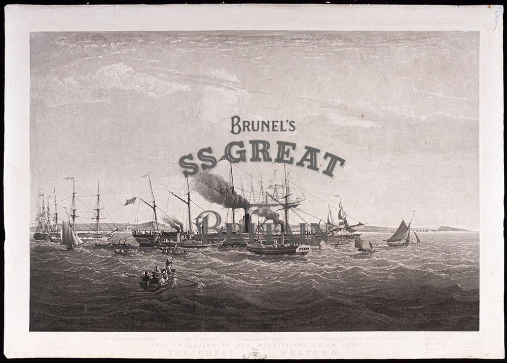 Below the print on the boarder is written: "In Commemoration of the Establishment of Steam Navigation Between Great Britain and America./THIS ENGRAVING OF THE MAGNIFICENT STEAM SHIP./THE GREAT WESTERN,". The dimensions of the ship and the names of the Directors are also listed below the print. The border of the engraving has been trimmed.