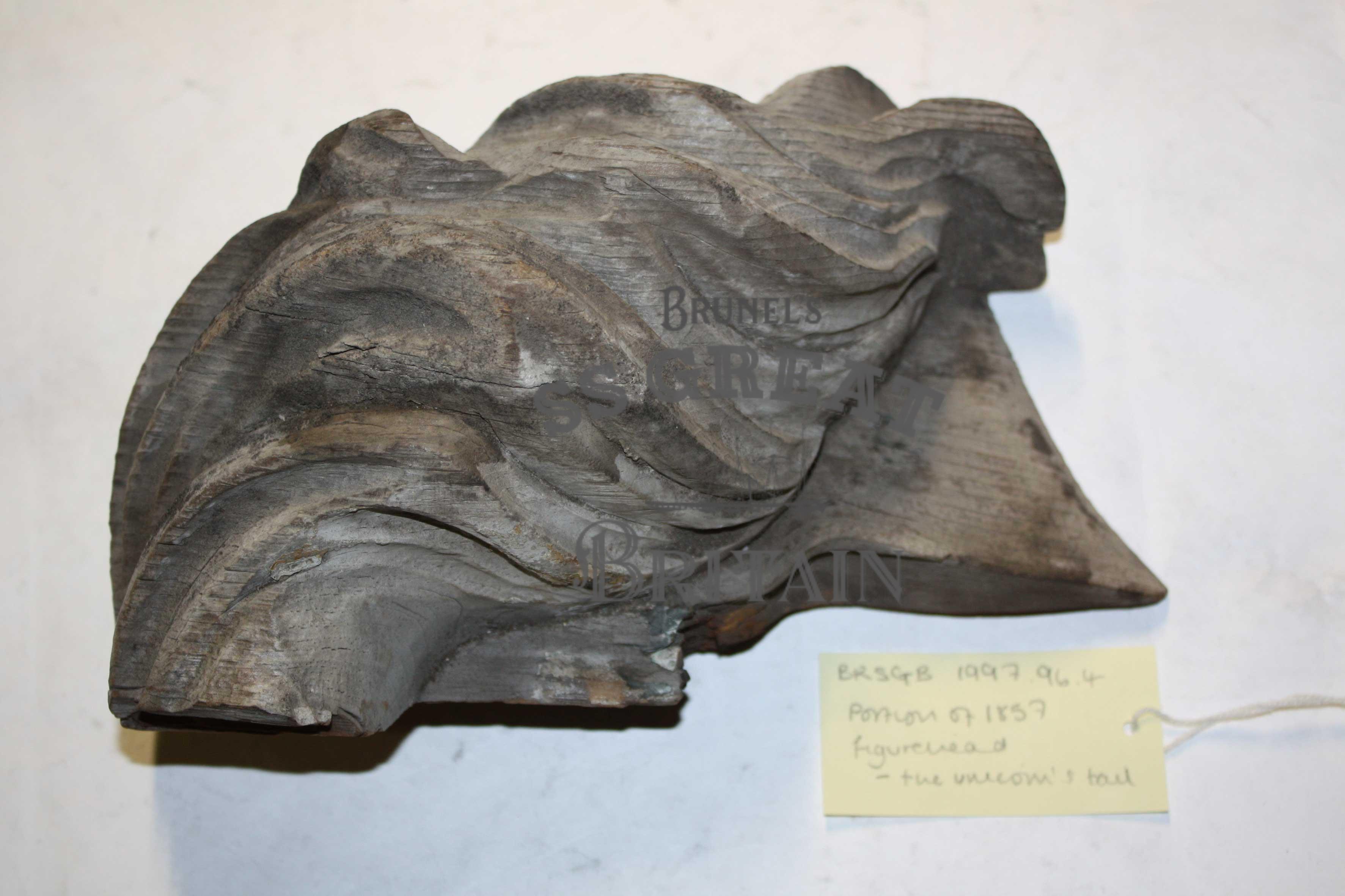 DescriptionA fragment of the 1857 figurehead of ss Great Britain. It would be a part of the unicorn, possibly the tail piece. Earthy grey in colour with little surface dirt. In relatively good condition.