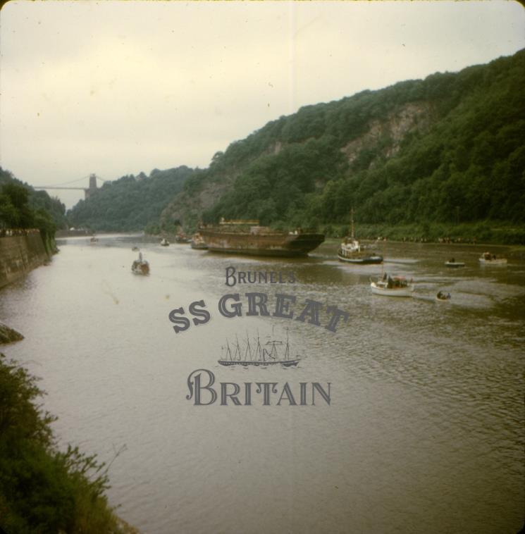 DescriptionImage of the ss Great Britain being towed up the river Avon. View of port side, looking from astern, Bristol Suspension Bridge in background.