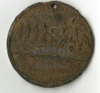 DescriptionCommemorative medal, The Great Britain steam ship 1843 launch. WM medal, 44mm, manufactured by J.Davis, Birmingham. Very poor condition. Obverse bears the heads of Queen Victoria and Prince Albert, facing left. Inscription on obverse reads: QUEEN VICTORIA AND PRINCE ALBERT. Reverse bears a starboard view of the vessel. Inscription on reverse reads: THE GREAT BRITAIN in exergue: LENGTH 322 FT. BREATH 50 FT. 6IN./DEPTH 32FT. 6IN. 26 STATE ROOMS/WITH 1 BED EH. 113 WITH 2 BED EH/TOTAL WHT OF IRON 1500 TNS./1000 HORSE POWER/LAUNCHED BY/H.R.H PRINCE ALBERT JULY 19 1843/BUILT BY THE GREAT WESTERN STEAM COMPY. Hole in top of medal.