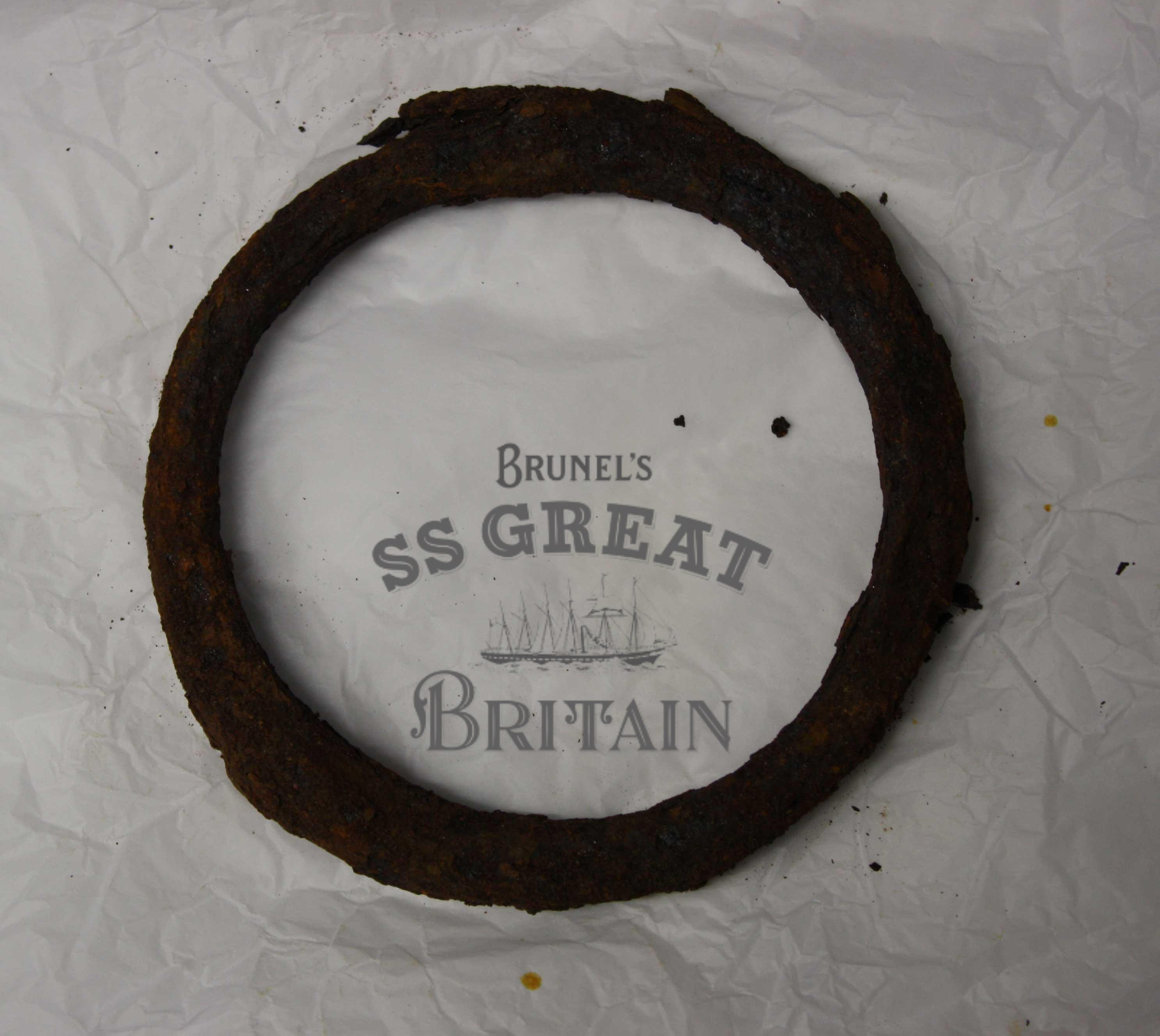 DescriptionRing, iron, 4 " diameter, 0.5 inch thick, corroded. Use unknown. Found in ship