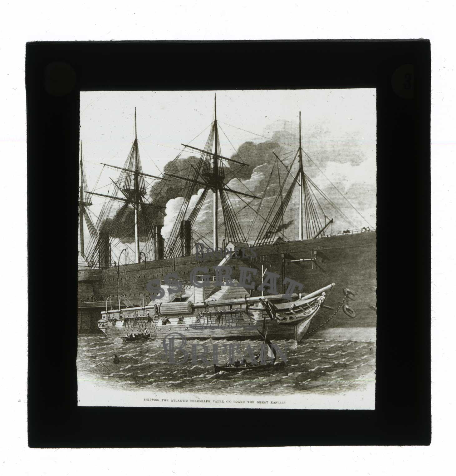 DescriptionShipping the Atlantic Telegraph Cable on board the Great Eastern. A steam-powered vessel is tethered alongside the ss Great Eastern and feeds cable up to a spout coming from the Great Eastern's deck. Rowboats and a sailing vessel are alongside. Glass negative from series of views of ss Great Eastern. 3x3 inches. Late 19th Century. File H 75. PH 1850's.