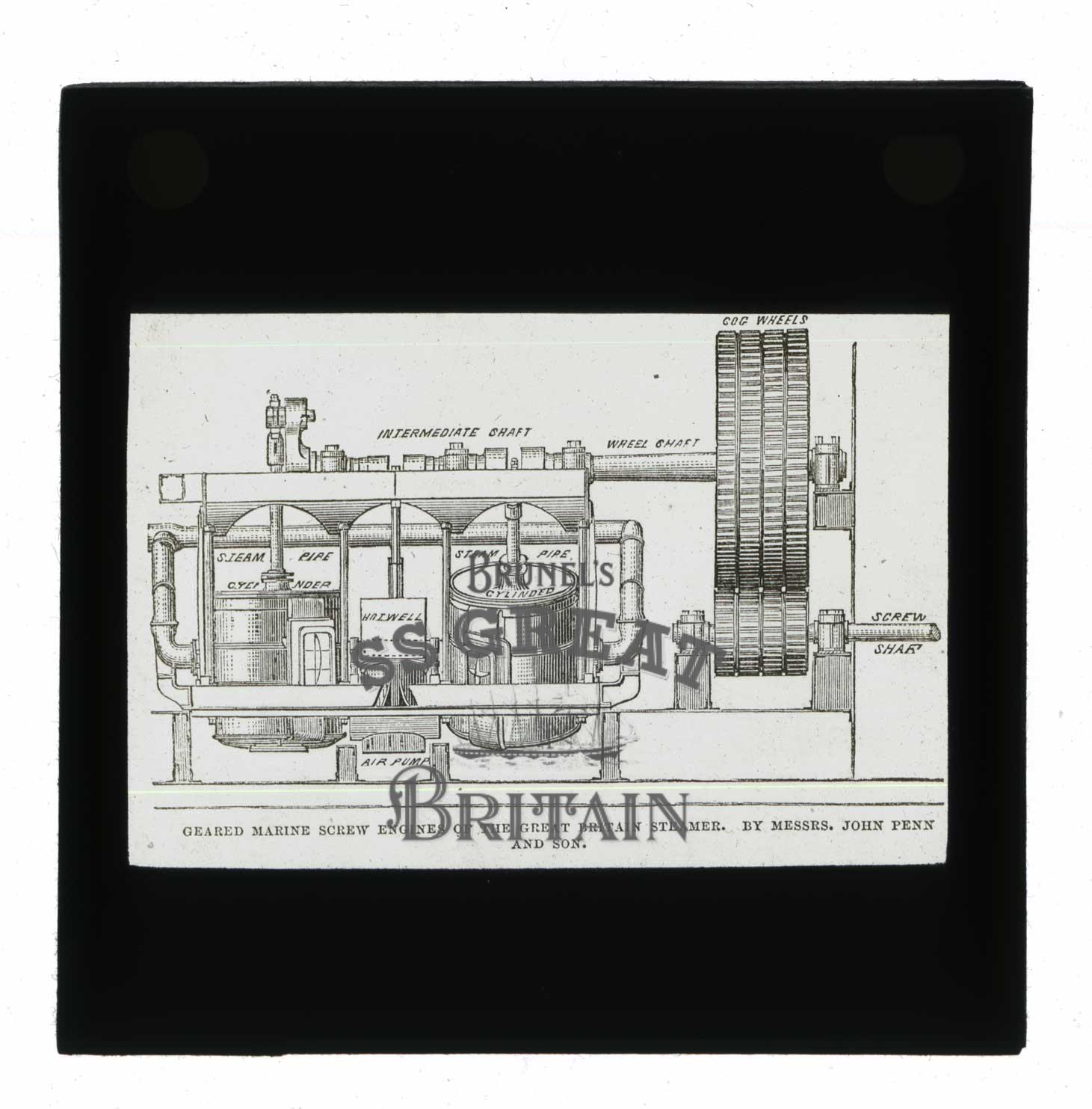 DescriptionGeared marine screw engines of the Great Britain steamer. Photograph of a line drawing of the engine mechanism of the ss Great Britain. The annotated drawing includes the piston cylinders, pipes, shafts and cogwheels. Designed by John Penn and Son. Glass negative from series of views of ss Great Eastern. 3x3 inches. Late 19th Century. File H 75. PH 1850's.