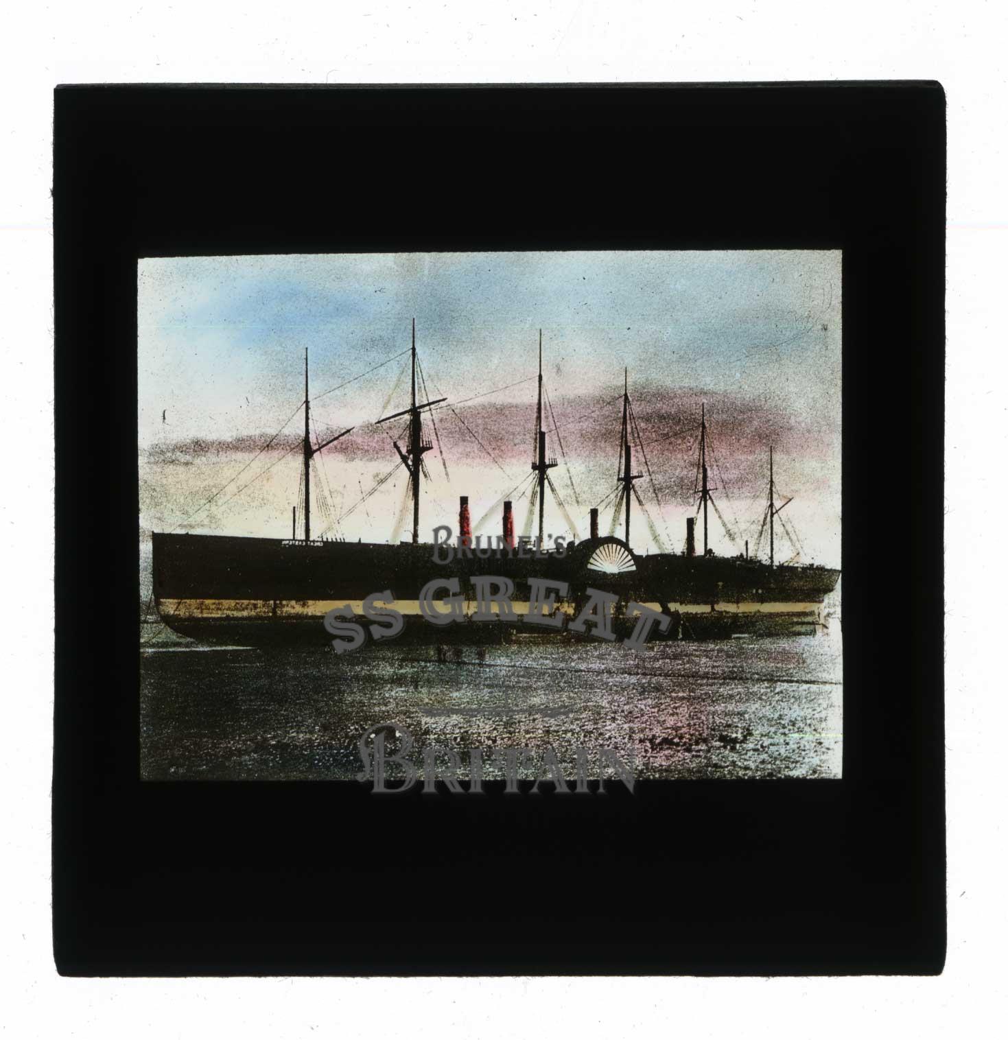 DescriptionView of ss Great Eastern at twilight. Hand-coloured depiction of the ss Great Eastern at low tide resting on mud. The four funnels and six masts are clearly seen against a cloudy sky. The image is tinted red, blue and yellow. Glass negative from series of views of ss Great Eastern. 3x3 inches. Late 19th Century. File H 75. PH 1850's.