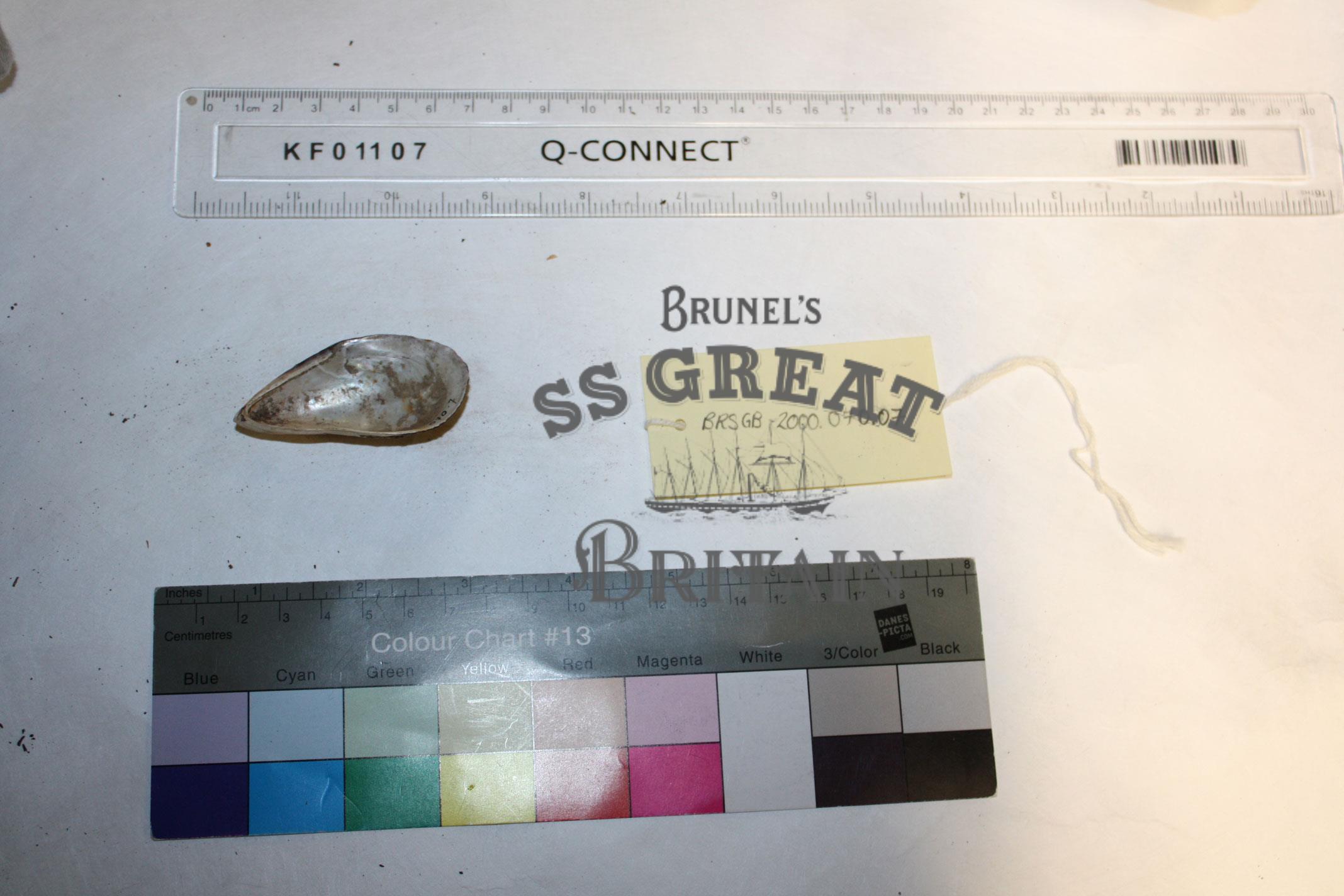 DescriptionMussel shell found on ss Greta Britain after she was slavaged from the Falkland Islands in 1970.