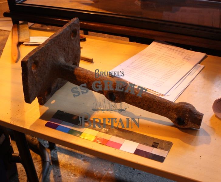 DescriptionSmall iron guardrail stanchion with base plate, but top half cut off.