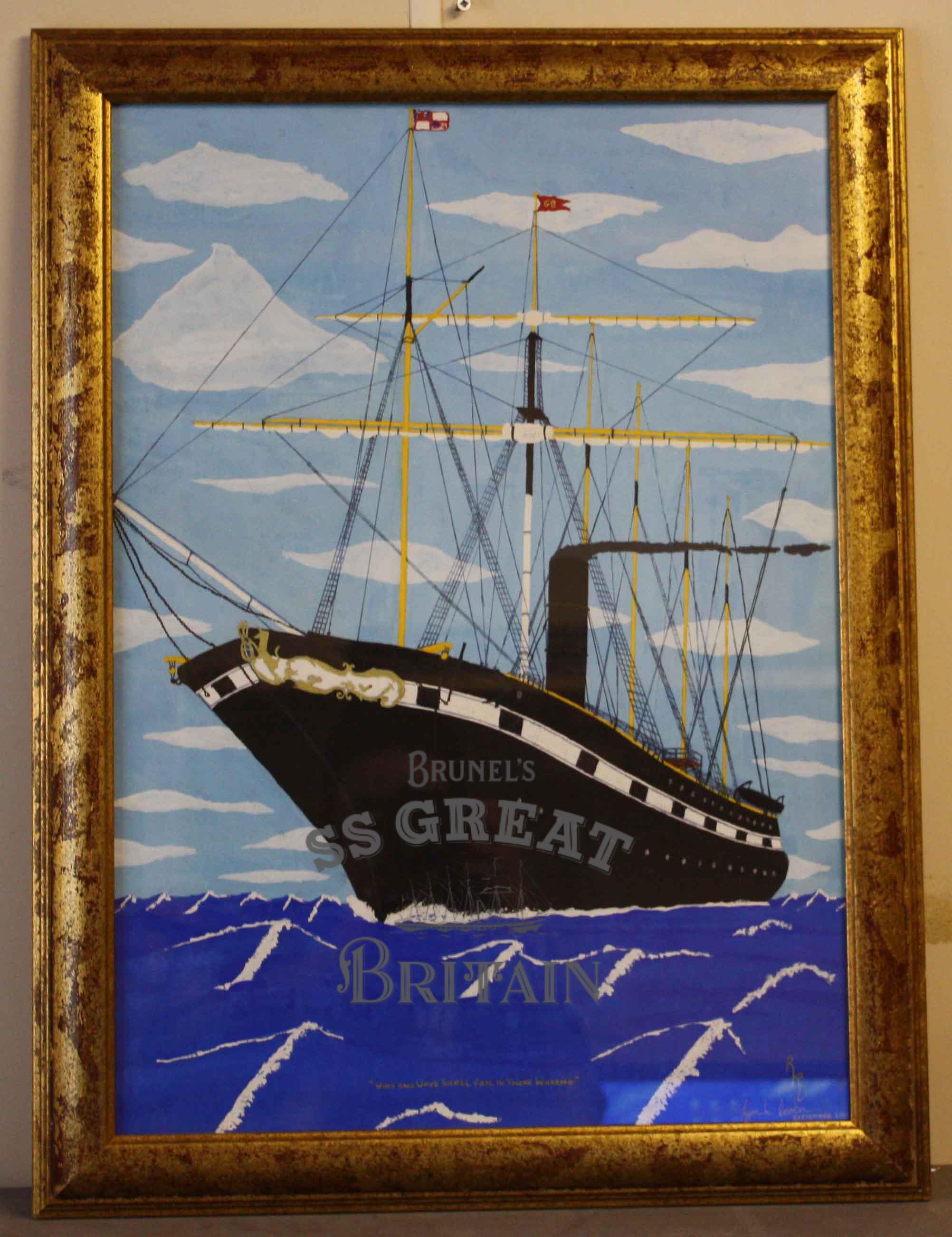 Description"Wind and Wave Shall Fail in There Warring". Watercolour of ss Great Britain. Capt. R. Deakin, September 2001. Ship shown with bow closest. Sails are down and dark grey smoke is emitted from the funnel. Choppy sea, clouds in sky. Spars are yellow and two ensigns fly from the masts. Framed and glazed. Wooden frame painted red and gold.