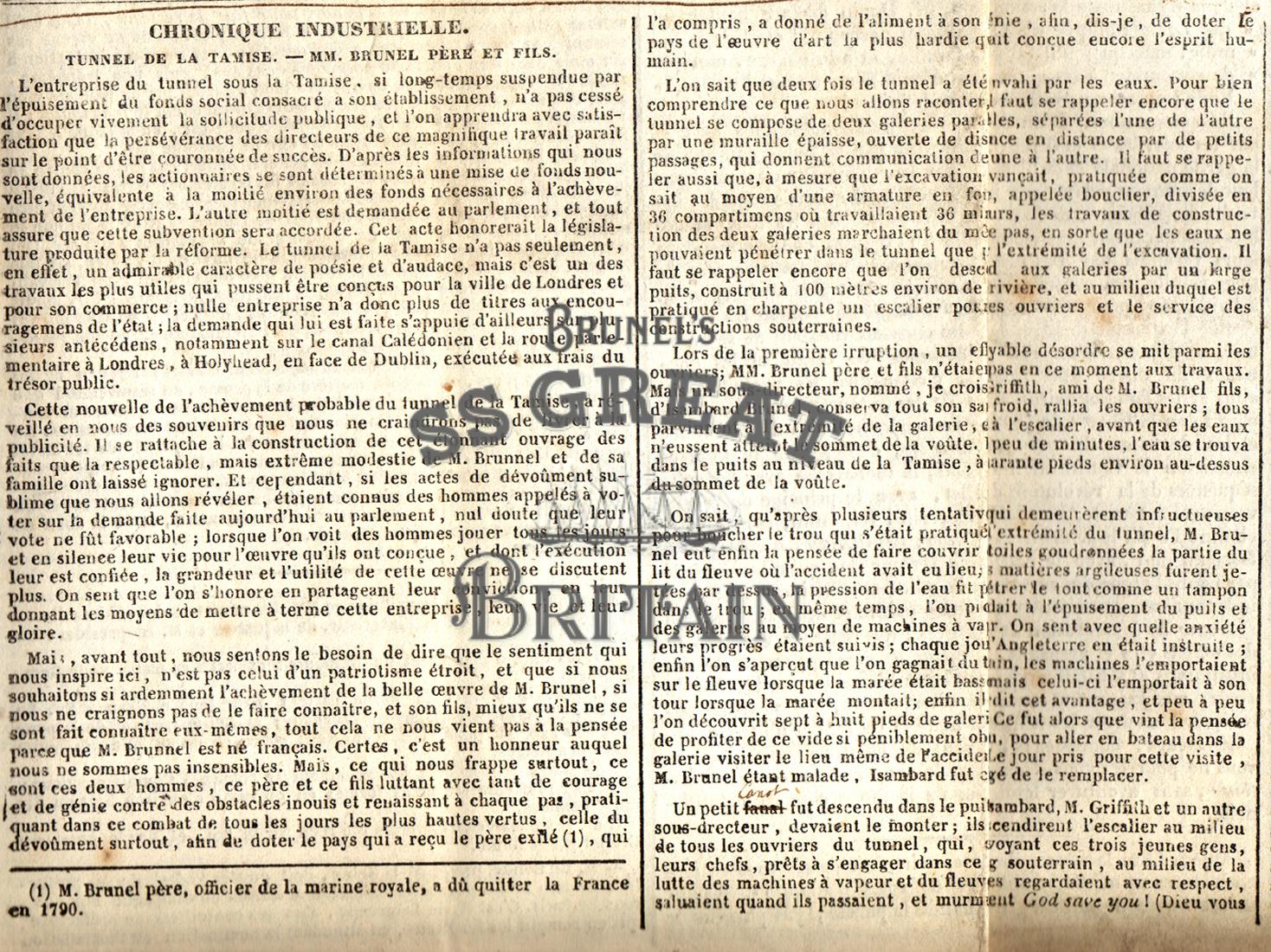 DescriptionAn original French newspaper cutting from 'Le Constitutionnel' for 26 June 1833 with an article about the Thames Tunnel titled 'Tunnel de la Tamise - Mm. Brunel père et fils'