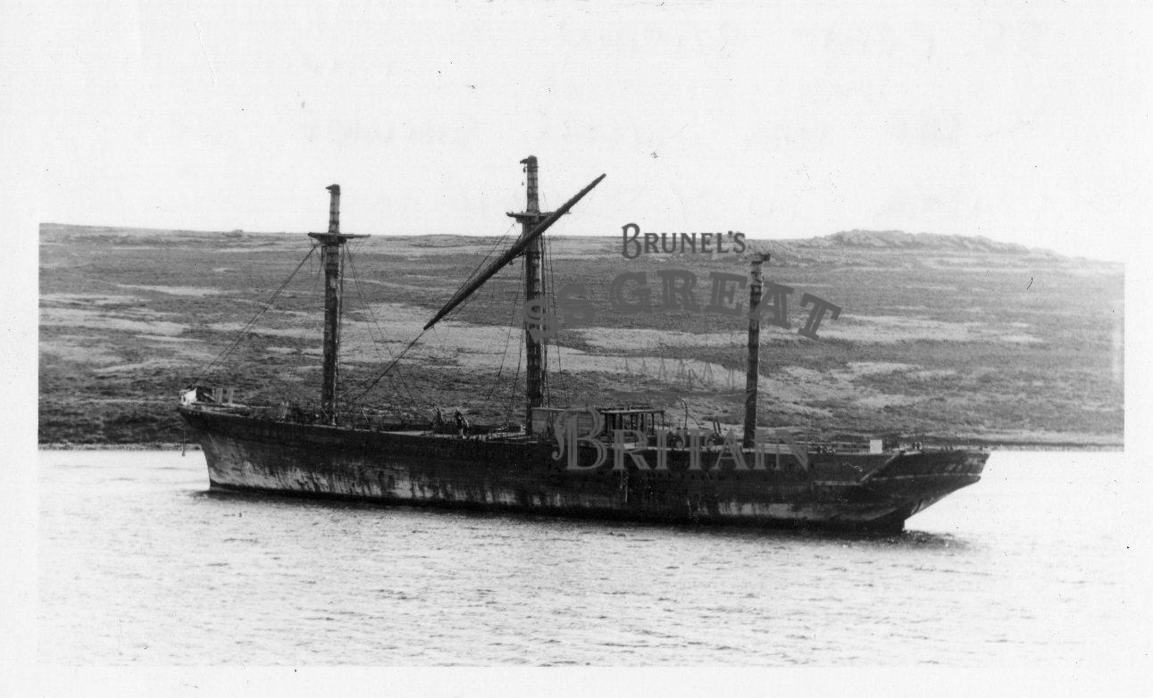 DescriptionSalvage of ss Great Britain, Falkland Islands. Ship in Sparrow Cove, view of port side.