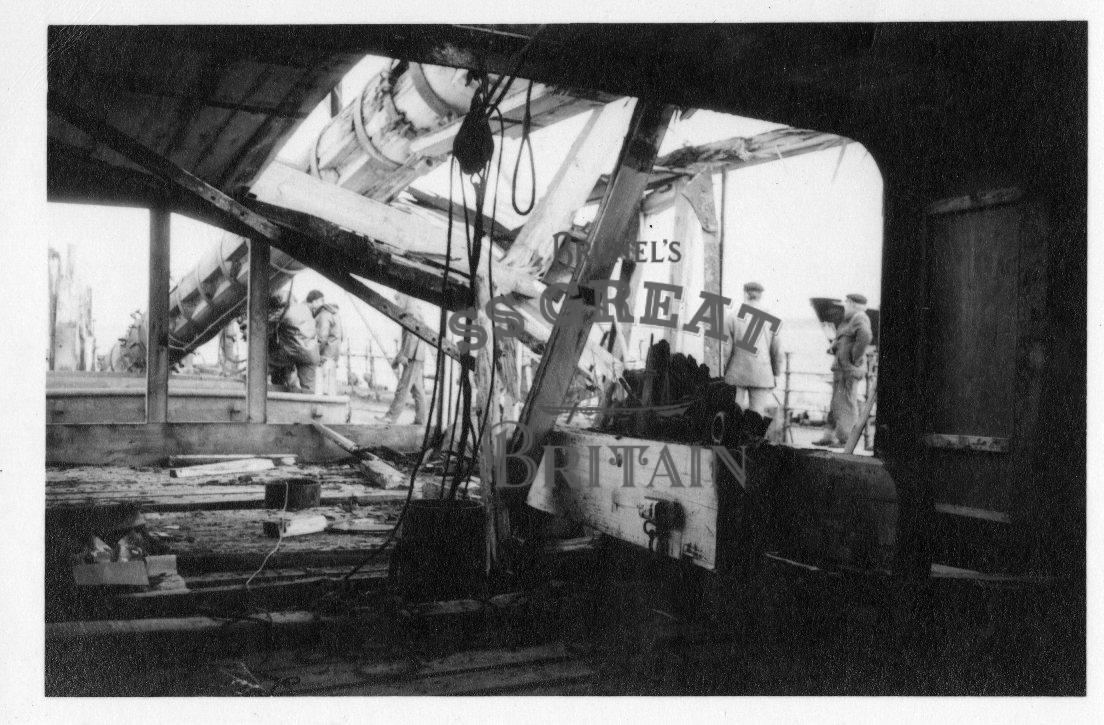 DescriptionSalvage of ss Great Britain, Falkland Islands. Main mast being taken down. Taken from inside deckhouse.