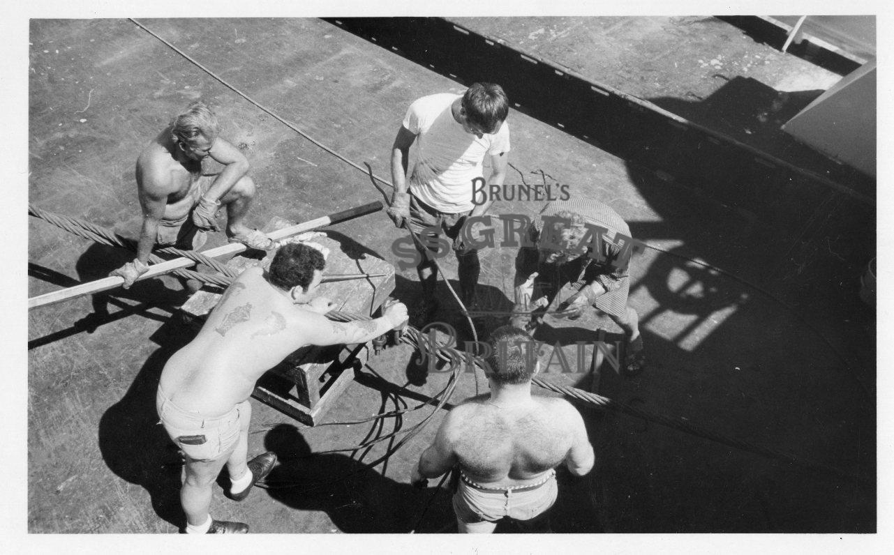 DescriptionSalvage of ss Great Britain, Falkland Islands. Unidenrified persons working on pontoon rope.