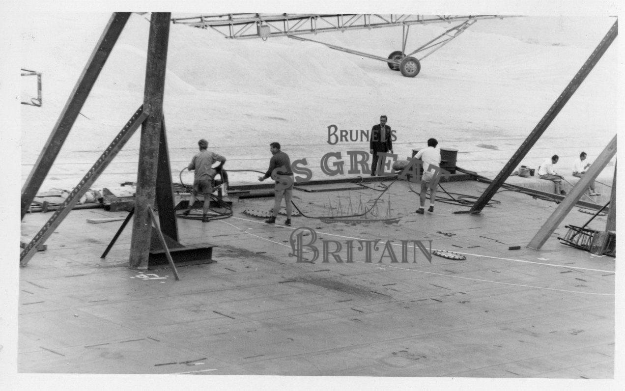 DescriptionSalvage of ss Great Britain. Unidentified persons docking pontoon.