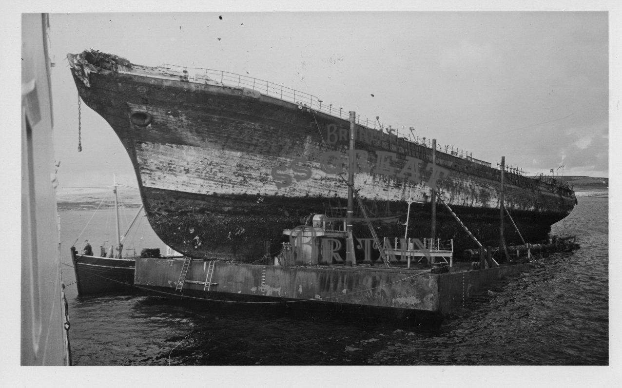 DescriptionSalvage of ss Great Britain, Falkland Islands. Ship on pontoon, emerging from water.
