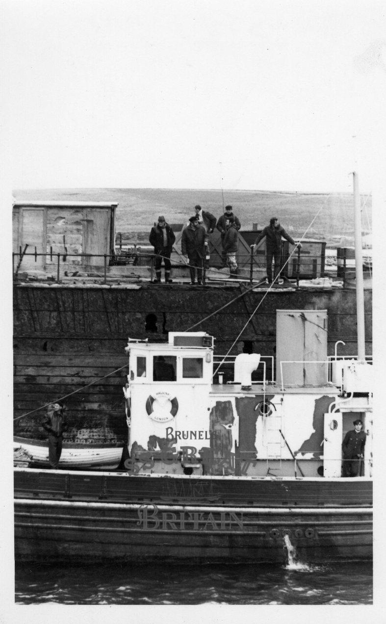 DescriptionSalvage of ss Great Britain, Falkland Islands. Detail of hull, smaller vessel moored alongside. Unidentified persons on board.