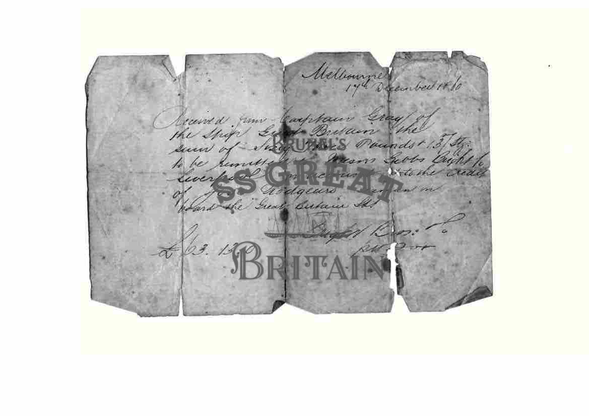 Received from Captain Gray of the Ship Great Britain the sum of Sixty Three Pounds & 13 s / Stg. to be remitted to Messrs Gibbs Bright .. Liverpool on account, to the credit of Jose Rodgeurs, seaman on board the Great Britain ..