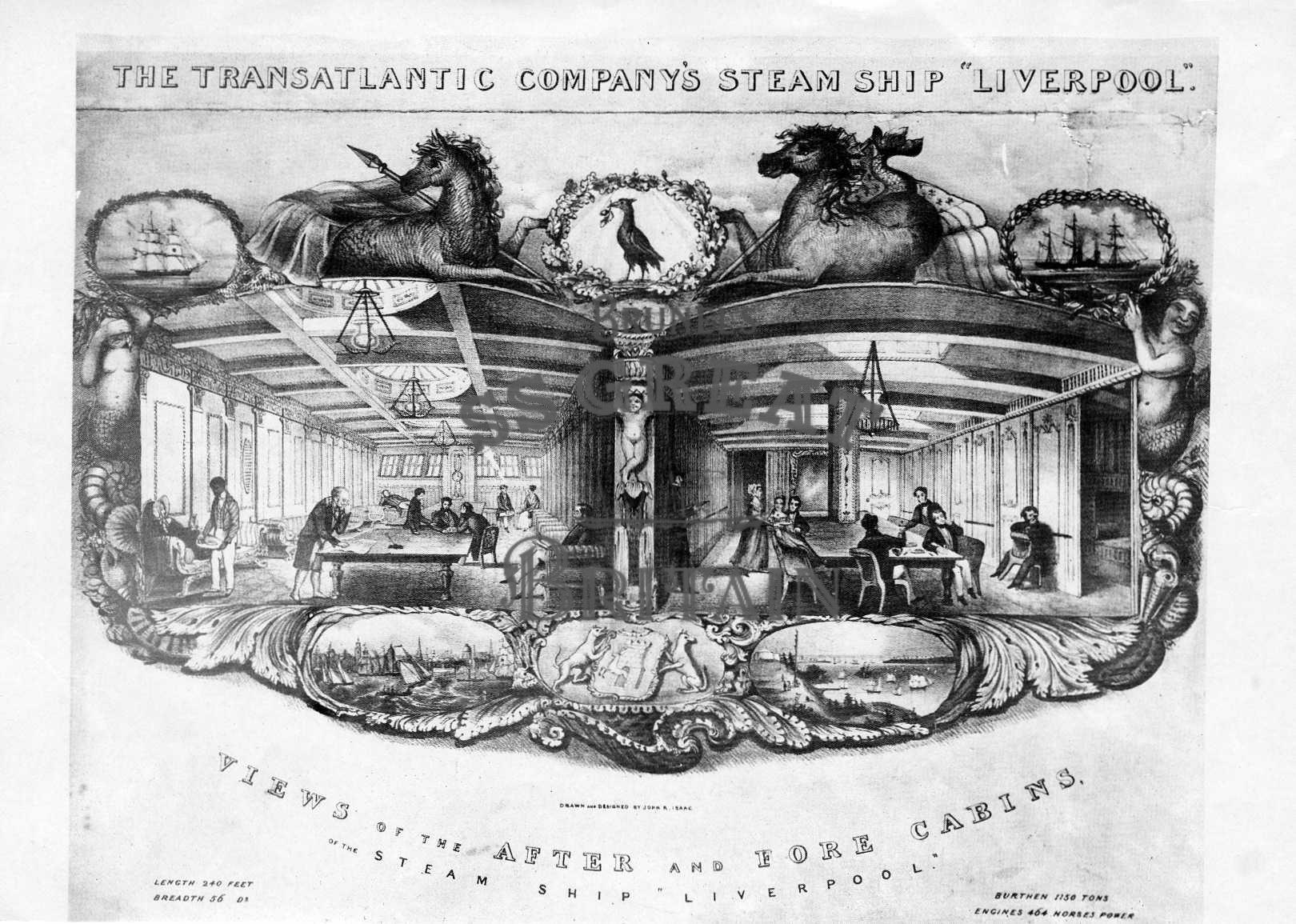 DescriptionFascimile of a decorated print depicting the after and fore cabins of ss Liverpool.