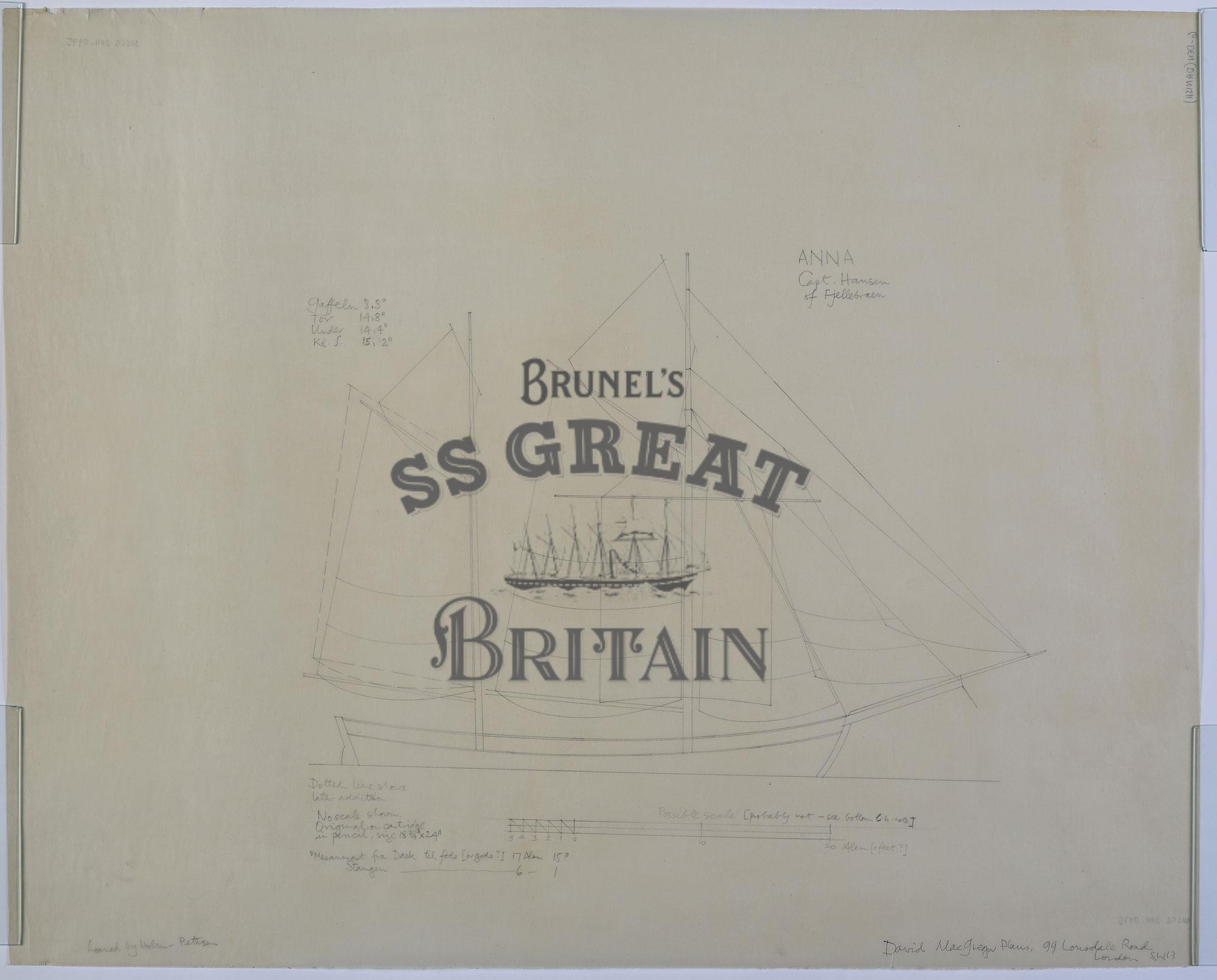 DescriptionDanish ship Anna. Sail plan. Traced by David MacGregor from original loaned by Holm-Petersen.