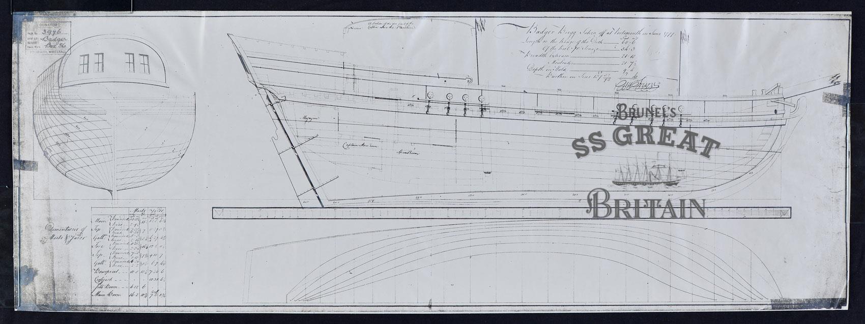 DescriptionBrig Badger. Lines plan (sheer plan, half breadth plan and body plan) and profile. Includes technical specifications.