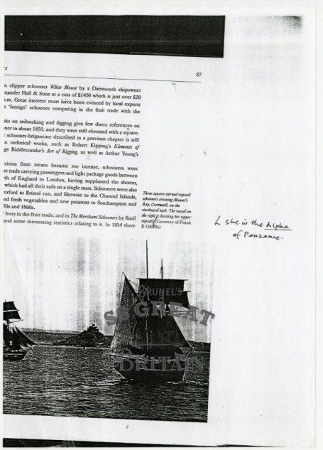 DescriptionPhotocopy of a book page no 87 from David MacGregor's book on schooners. Revisions and notes have been made to the caption of the image. The photocopy was enclosed with the copy of a letter to Julian Mannering, dated 5 January 2001, from David MacGregor regarding some revisions for his book on schooners.
