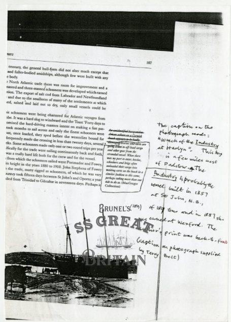 DescriptionPhotocopy of a book page no 107 from David MacGregor's book on schooners. Revisions and notes have been made to the caption of the image. The photocopy was enclosed with the copy of a letter to Julian Mannering, dated 5 January 2001, from David MacGregor regarding some revisions for his book on schooners.