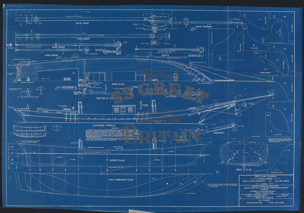 DescriptionGreat Lakes schooner Challenge. Lines plan (sheer plan, half breadth plan and body plan), general arrangement (deck plan and profile) and rigging details.