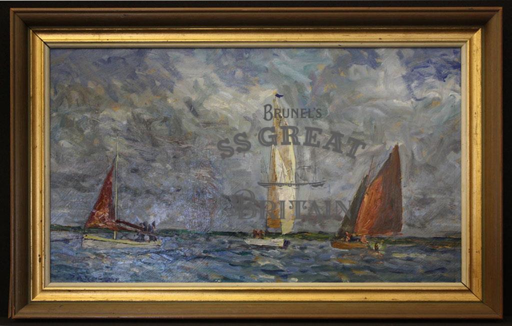 DescriptionMarine painting, seascape, depicting pleasure yacht and barges under sail at sea at Morston Creek.